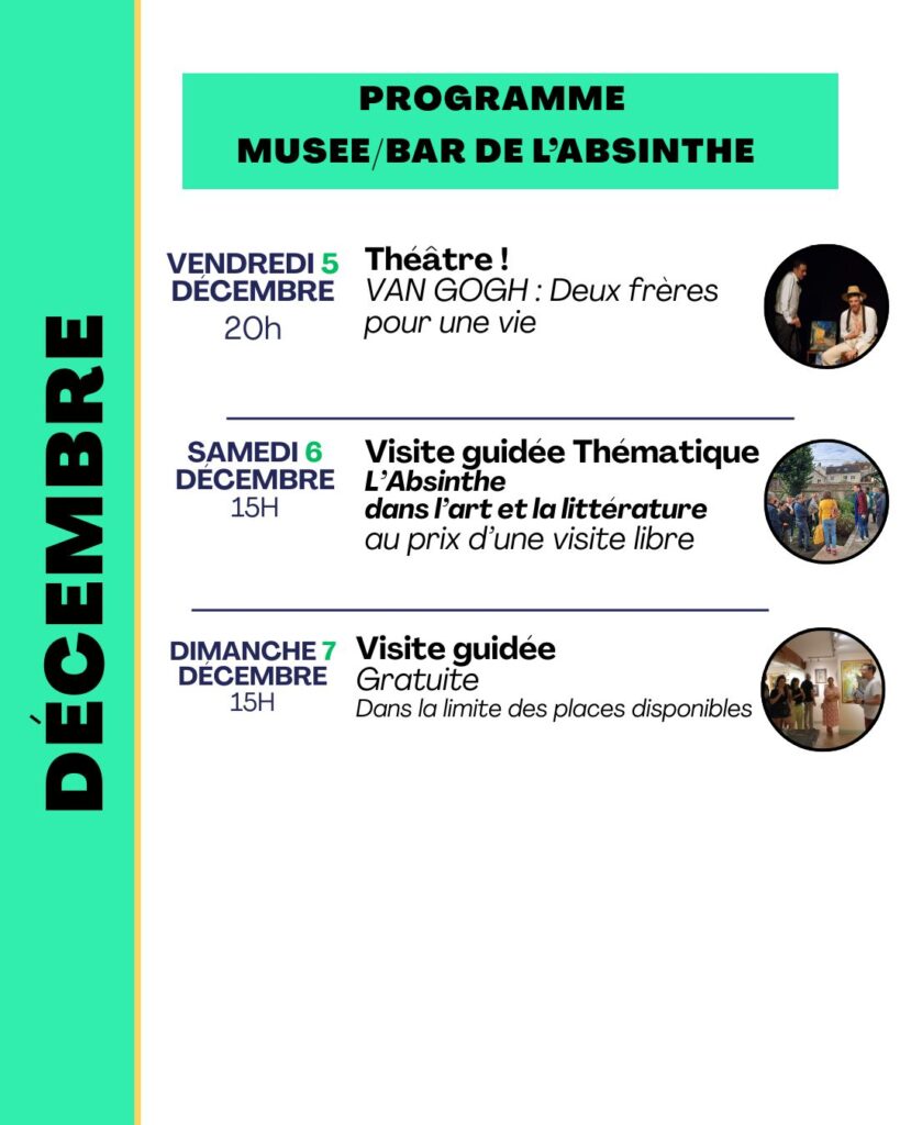 Le Musée de l’Absinthe vous donne rendez-vous toute l’année pour tous types d’événements. Visite guidée aux lueurs de la bougie, Spectacles avec le Horla de Maupassant, 24 Heures de la vie d’une femme de Zweig et Van Gogh : Deux frères pour une vie et bien d’autres, Jeu de piste, Soirées à Thèmes, Visites guidées thématiques, Expositions, Ateliers théâtre et d’écriture…